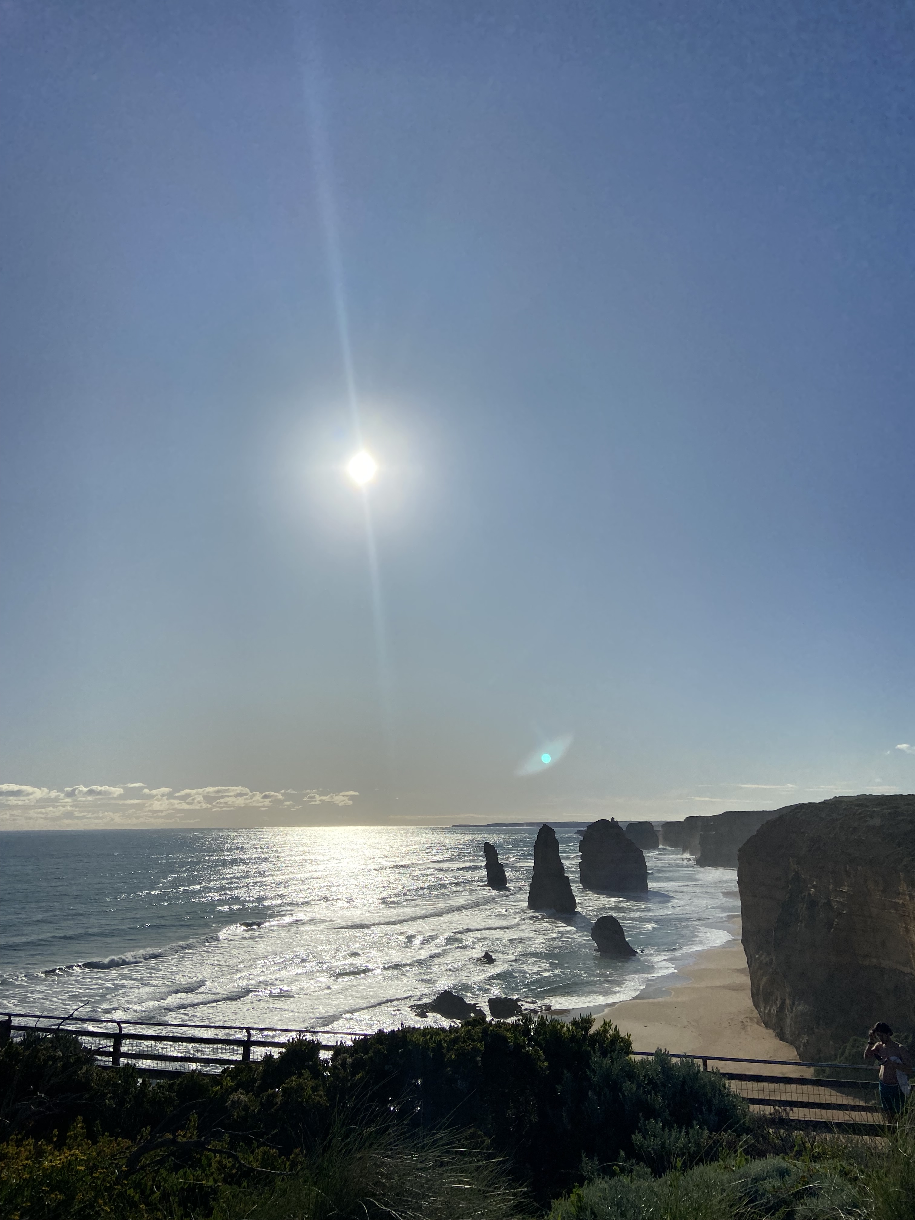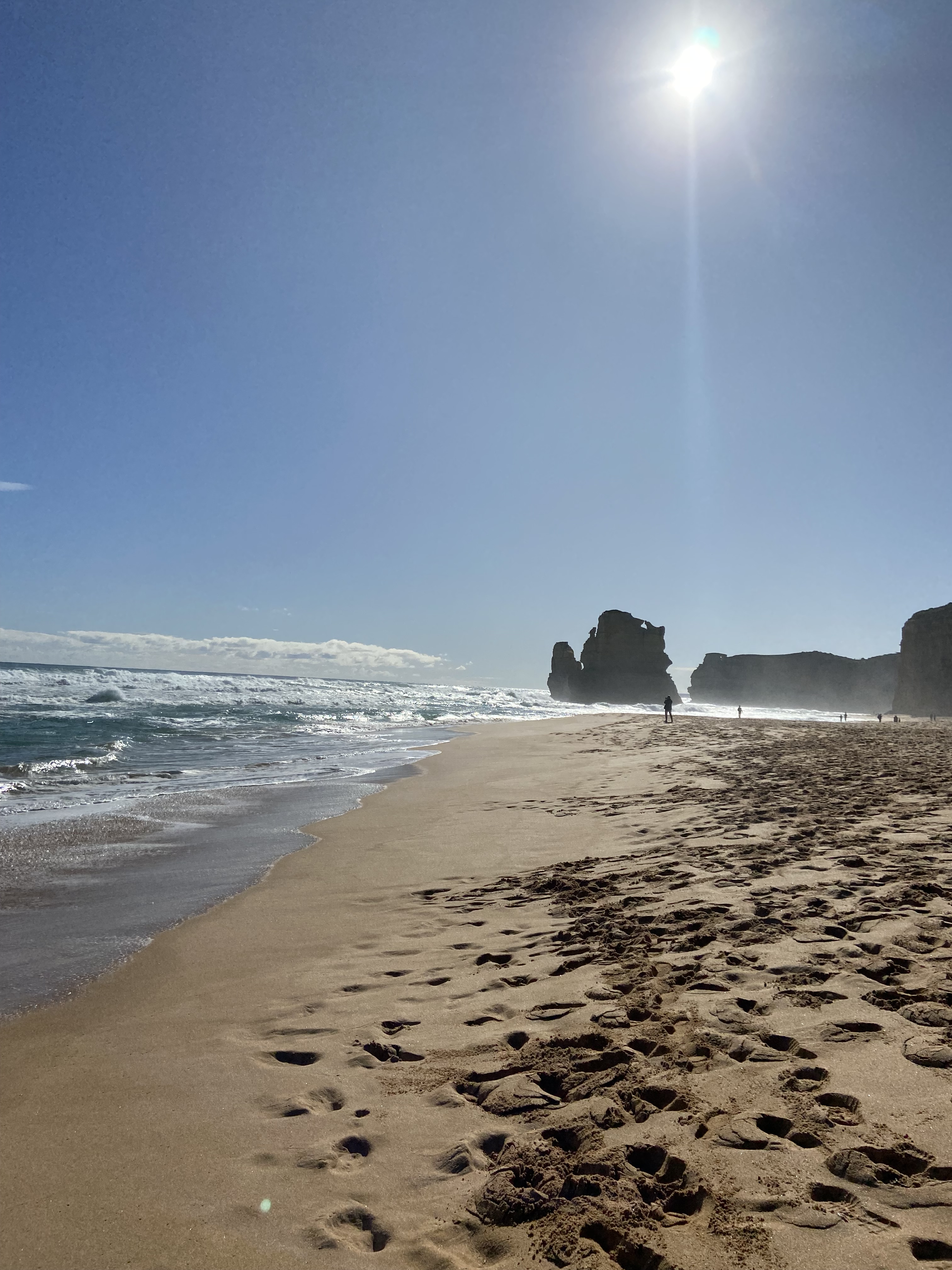 We stretched our legs again at Princetown Beach. The weather was on our side, so we had a paddle in the sea and a bit of a sit-down in the sun. There are dozens of equally gorgeous beaches along the ocean road, so it was good to have loads of time and no need to rush. After Princetown, we stopped to see the main attraction on the Great Ocean Road. The Twelve Apostles stood proudly against the buffeting waves, silhouetted by the sun and the reflection of the water. We counted less than a dozen limestone pillars, but they still looked very impressive.