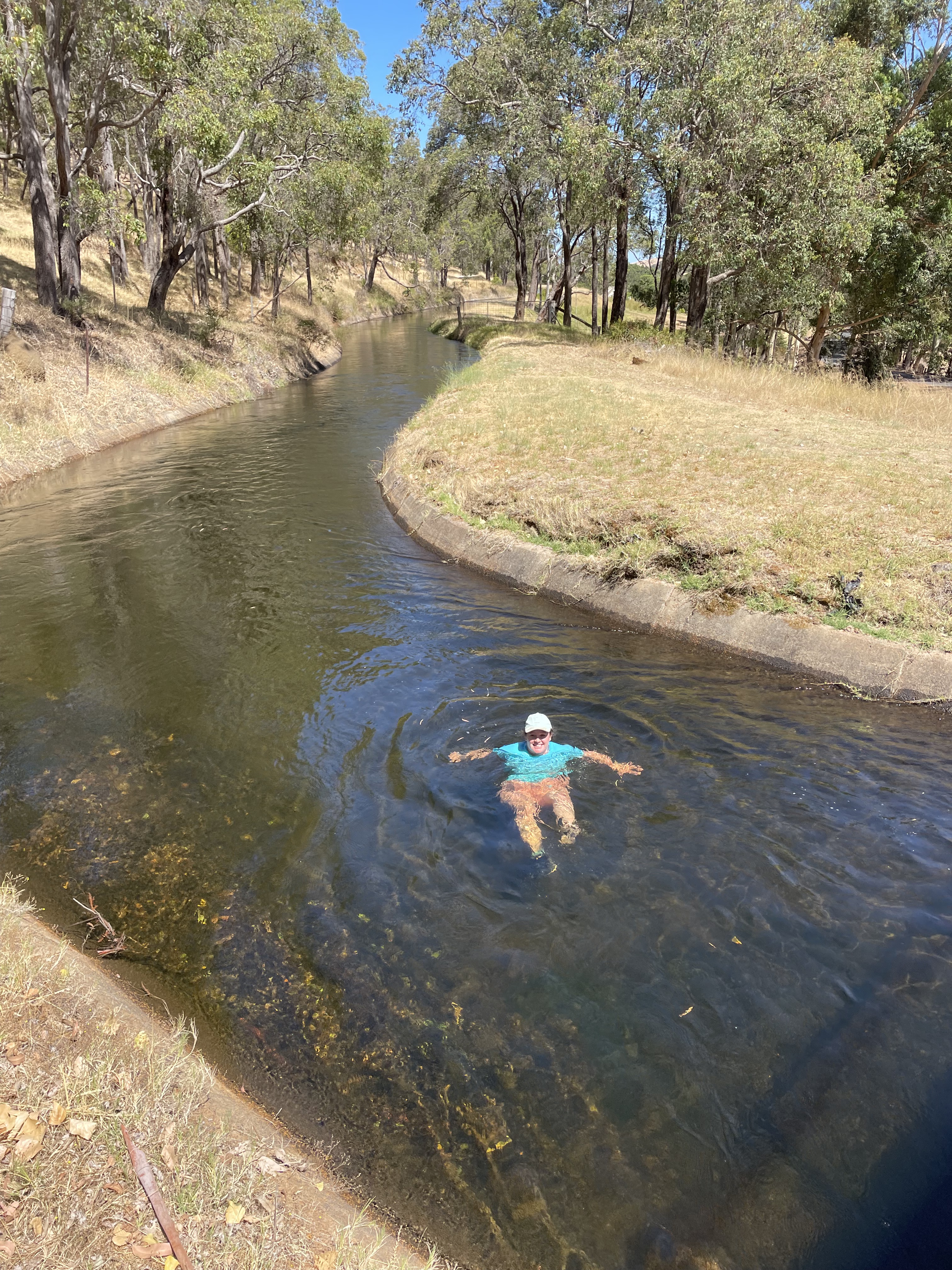 Our favourite place in the area, though, was a swimming hole just outside of the town of Collie, called Minningup Pool. Here the Collie River slows and meanders lazily around large bends in the river, creating perfect pools to safely swim and cool off in the hot WA summer weather. There was also an irrigation channel which bordered our host’s land which was clean and concreted, and we were able to float downstream through the bush for about half a mile, and then walk back on the road. We loved doing this in the 40 degree heat.