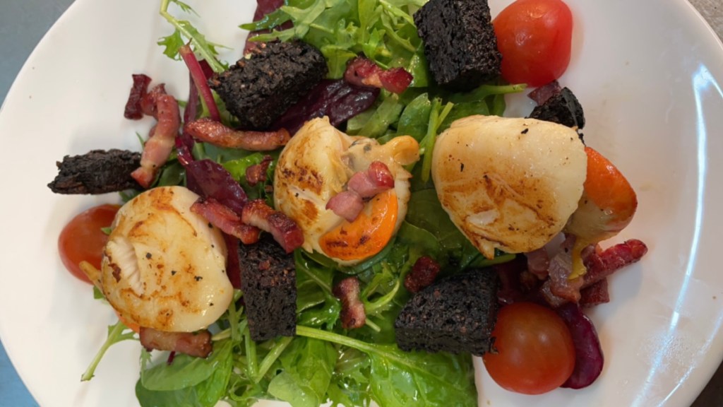 - After 3 minutes, turn scallops and black pudding, the scallops should’ve started to caramelise on the cooked side. After another