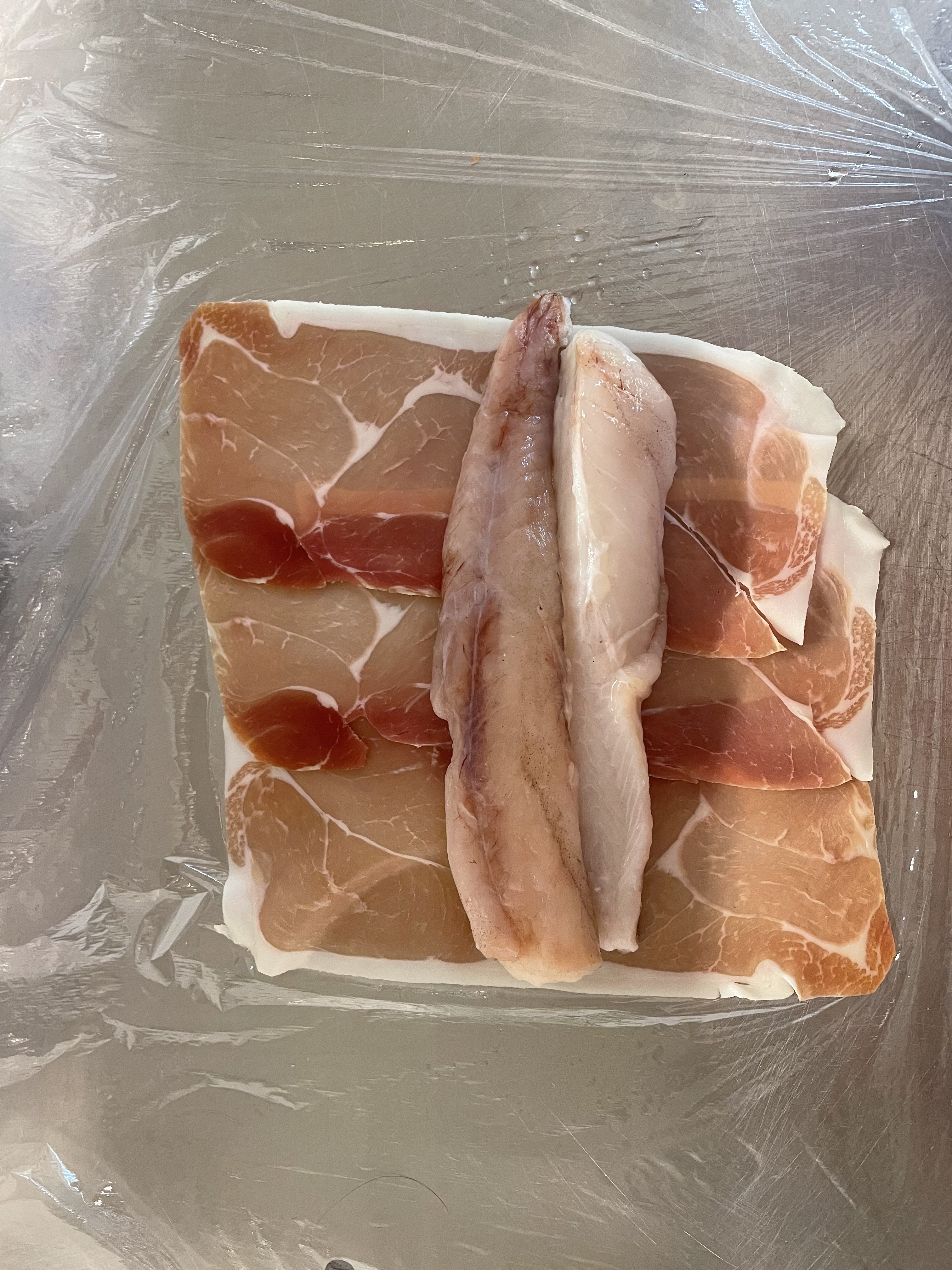 - Lay out 3 slices of the ham, so that they overlap slightly on the longest edge. Lay 2 monkfish loins across the ham and gently roll the fish up in the ham. Wrap tightly in cling film so that it keeps its shape. Repeat. Place both in the fridge for now.