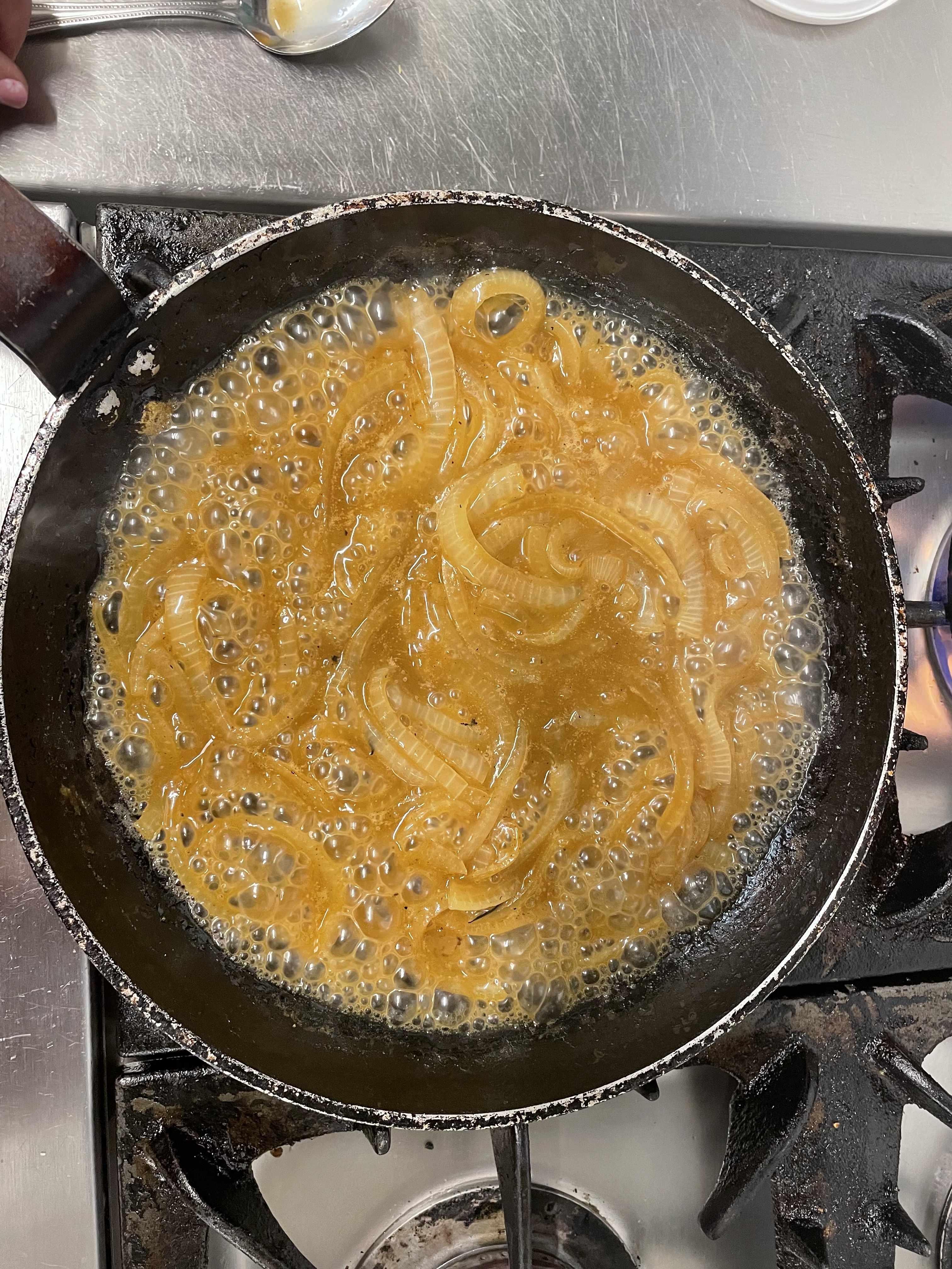 - Add the stock to the pan. Allow this to simmer gently on a low heat so that it thickens and forms a very sticky golden sauce.